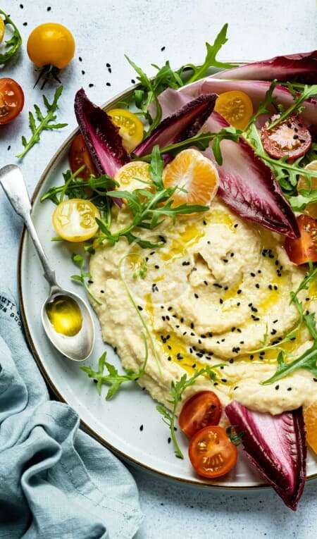 Smooth hummus, microgreen top, olive oil, sliced veg